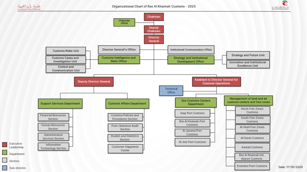 The Customs Affairs Department is competent in developing and following up accurate application of customs procedures and policies at the customs centres of Ras Al Khaimah. This application is ensured to be in accordance with the GCC Common Customs Law, other relevant laws, including the WCO rules and regulations. This is achieved in full coordination with the UAE Federal Customs Authority.